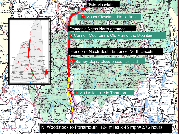 1961 map of the route the Hills took on September 19, 1961. (Labels added by Kathleen Marden. Copyright protected)