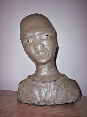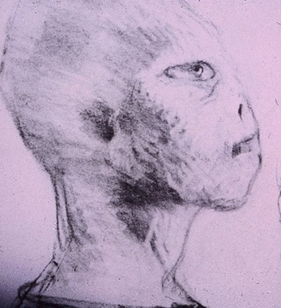 Betty's recovered memories were of beings with enlarged cranial structures and light gray skin. She stated that her sculpture was darker than the actual skin color that she recalled. They had enlarged eyes with yellow sclera, flattened noses with turned up nostrils, and a slit for a mouth. (Copyright protected. All rights reserved.)